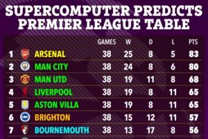24直播网04月27日讯 英超争冠和保级都进入关键阶段,超算预测了本赛季的英超大结局,阿森纳将以3分优势夺冠,而热刺将降级。