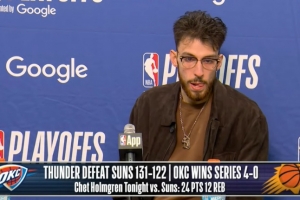 24直播网4月28日讯 NBA季后赛首轮G4,雷霆131-122胜太阳,大比分4-0晋级。赛后雷霆球星霍姆格伦接受了媒体采访,以下为完整版采访内容。