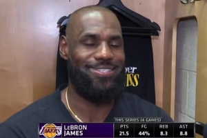 24直播网4月28日讯 昨日湖人96-115客场不敌火箭,系列赛大比分变为3-1。赛后,湖人球星詹姆斯接受采访时发生了搞笑的一幕。