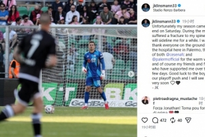 小克林斯曼写道:“我的赛季不幸于上周六宣告结束。在比赛中,我的脊柱遭遇骨折,将因此缺阵一段时间。我想感谢巴勒莫现场以及医院里的每一个人,感谢切塞纳和巴勒莫两家俱乐部的球迷们送来的暖心祝福,当然,更要感谢过去几天里一直支持着我的朋友们和家人们。祝愿小伙子们在冲击季后赛的征程中好运,我很快就会与大家再见。”