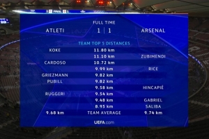 24直播网4月30日讯 马竞在本轮欧冠半决赛首回合1-1战平阿森纳,两队跑动数据如下:
